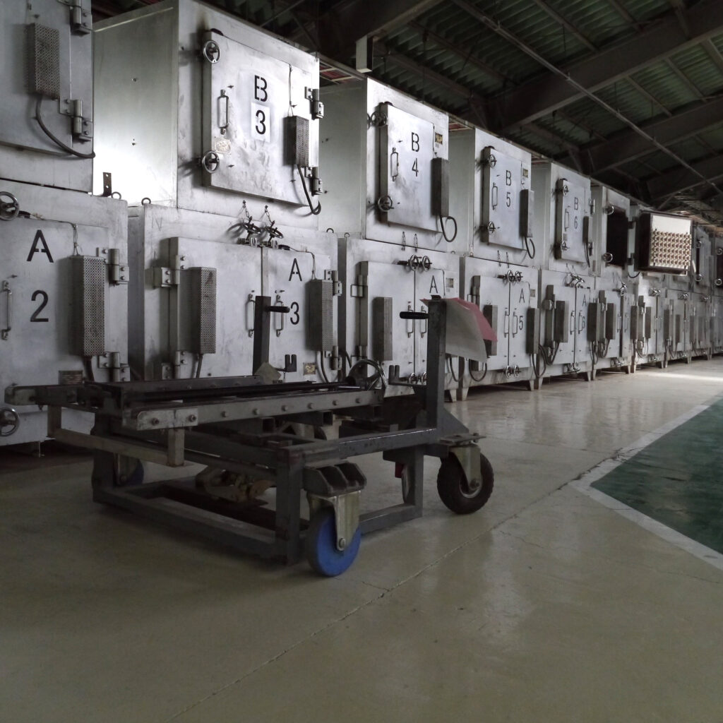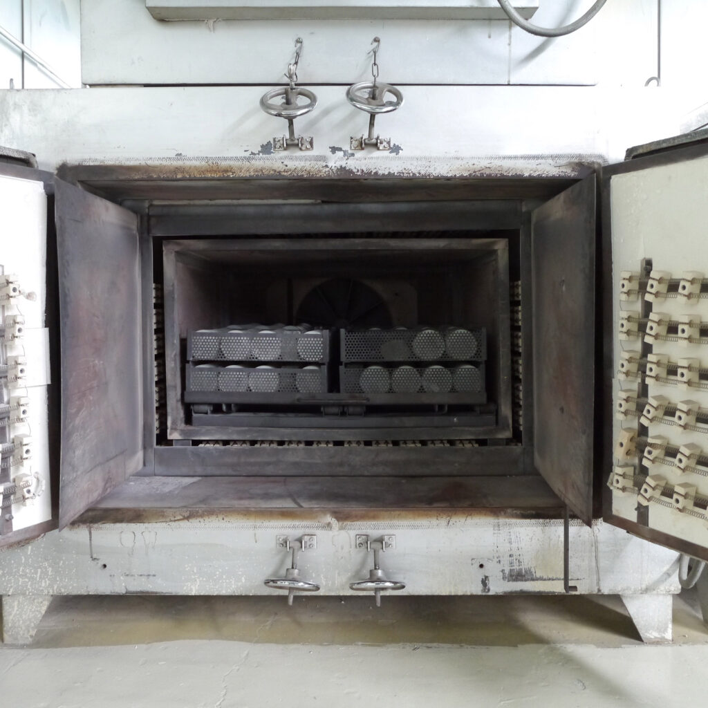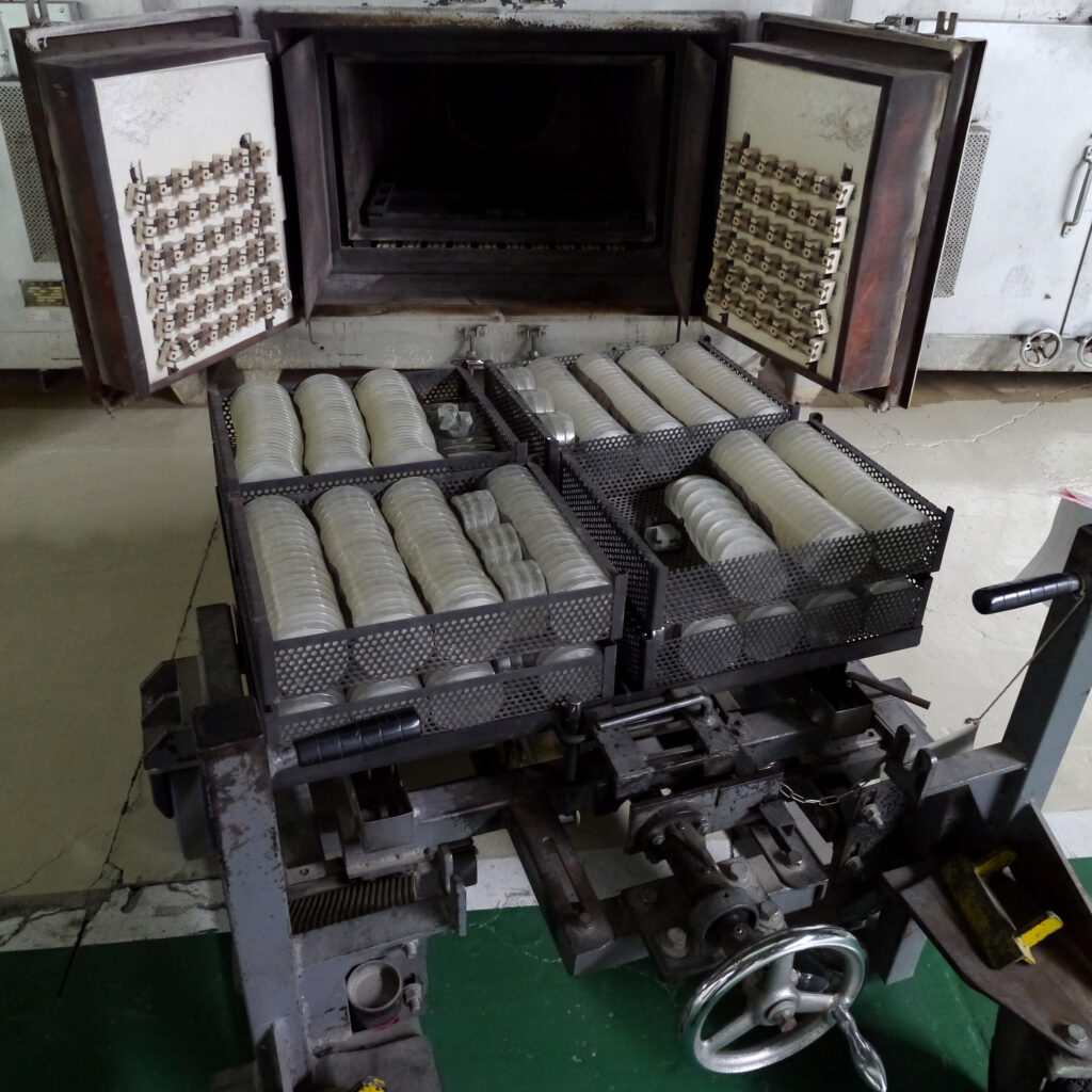 光学ガラスの種類それぞれに固有の屈折率に合わせるべく、アニール工程は厳密な温度管理のもとで行われます。上の写真は、プレスされたレンズ原形をアニール炉の中へと専用のローダーを用いて装填している場面です。同一のアニール炉の中に入れるのは同種の硝材であることはもちろん、光学ガラス素材を製造するときに原材料を熔解したポットナンバーも同一であることが条件です。このようにして完全に同窓かつ同期であることがトレースできる状態でグループ分けされたレンズ原形たちは、それぞれの素性にあわせたアニールスケジュールにより、正しい屈折率に導かれていくのです。