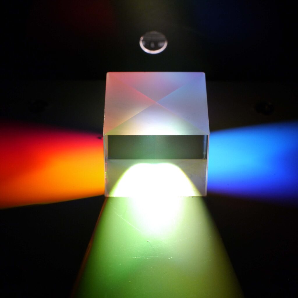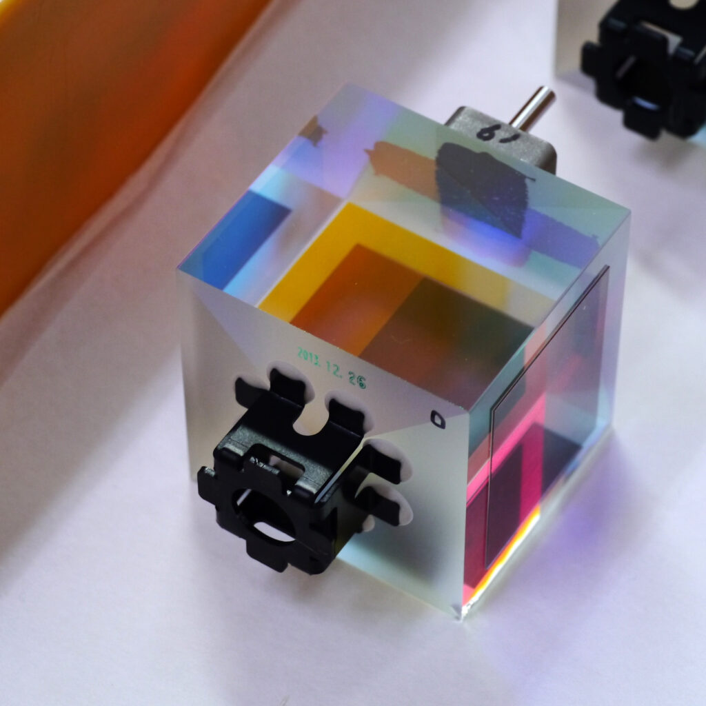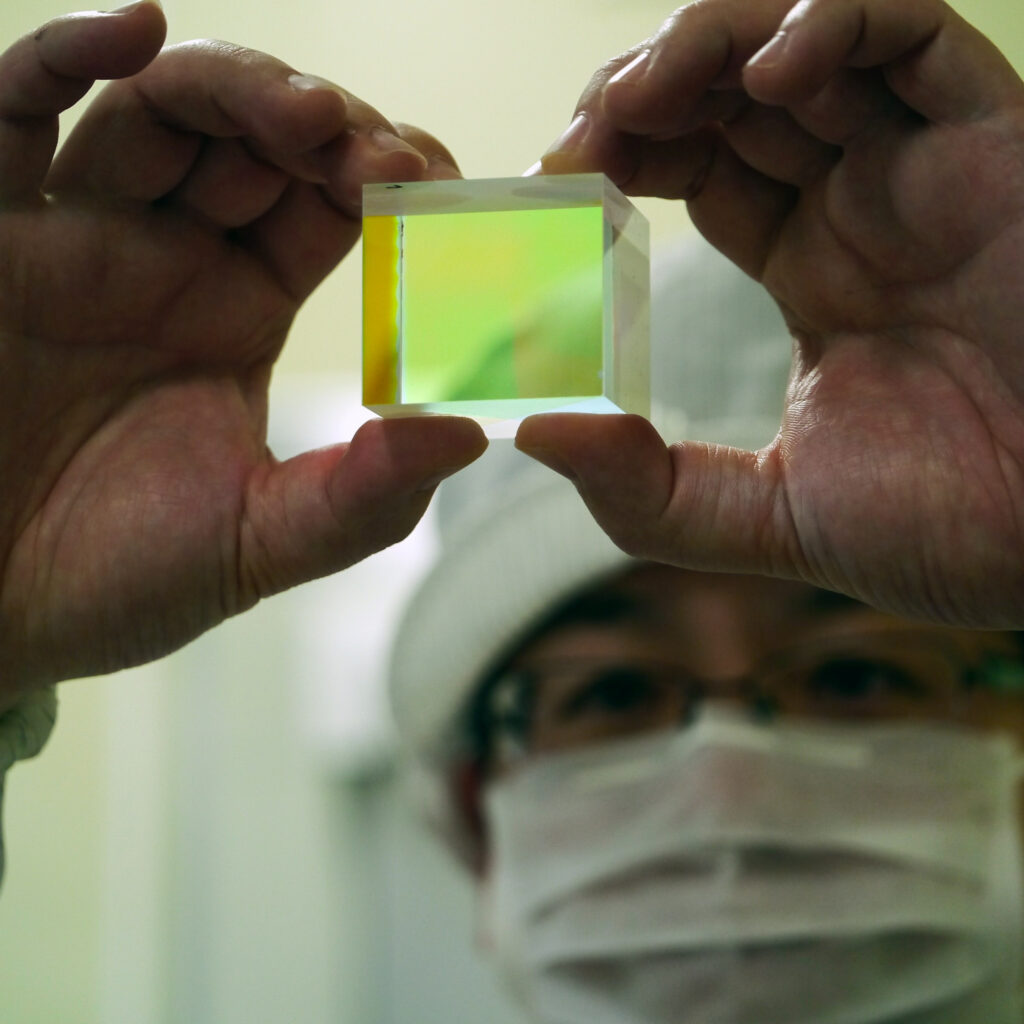 透明な光学ガラスで作られているのに、光にかざすと淡いグリーンやイエローなど、さまざまな色の表情を見せる不思議な物体。上の写真は、コシナ七瀬ファクトリーで製作された特別な用途に使われるプリズムを手にしている様子です。立方体に近い形で、ひとかたまりのガラスブロックに見えますが、実は4つの直角プリズムを精密に張り合わせて作られています。そしてプリズムが接触している張り合わせの面には、特殊なコーティングが施されているのです。この光学デバイスの目的とは、ある波長域の光だけを反射させ、それ以外の領域の光を透過させてしまうこと。白く見える光源を色に分け、それをふたたび混ぜ合わせることから“分離合成光学系”と呼ばれるジャンルに多く応用されています。