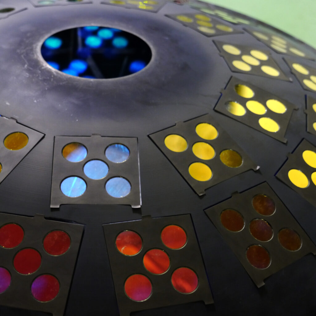 一般的に写真撮影用のレンズでは、複数枚で構成されるレンズそれぞれの面で不要な反射をどれだけ防ぎ、入ってきたままの光を透過させるかに注力するものですが、分離合成光学系では、特定の波長域の光だけを反射させることができるかが重要になります。これらの特性を持つ光学デバイスには、ダイクロイックミラーやダイクロイックプリズムなどがあります。反射を防ぎ均質に光を透過させるためのコーティングを達成するには多くの困難を克服する必要がありますが、それ以上に複雑なプロセスとシビアなコントロールを経て、ダイクロイック光学デバイスは製造されています。用途によりますが、コーティングの膜層は、反射防止マルチコーティングよりも多く、時には50層ものコーティングが施されているのです。