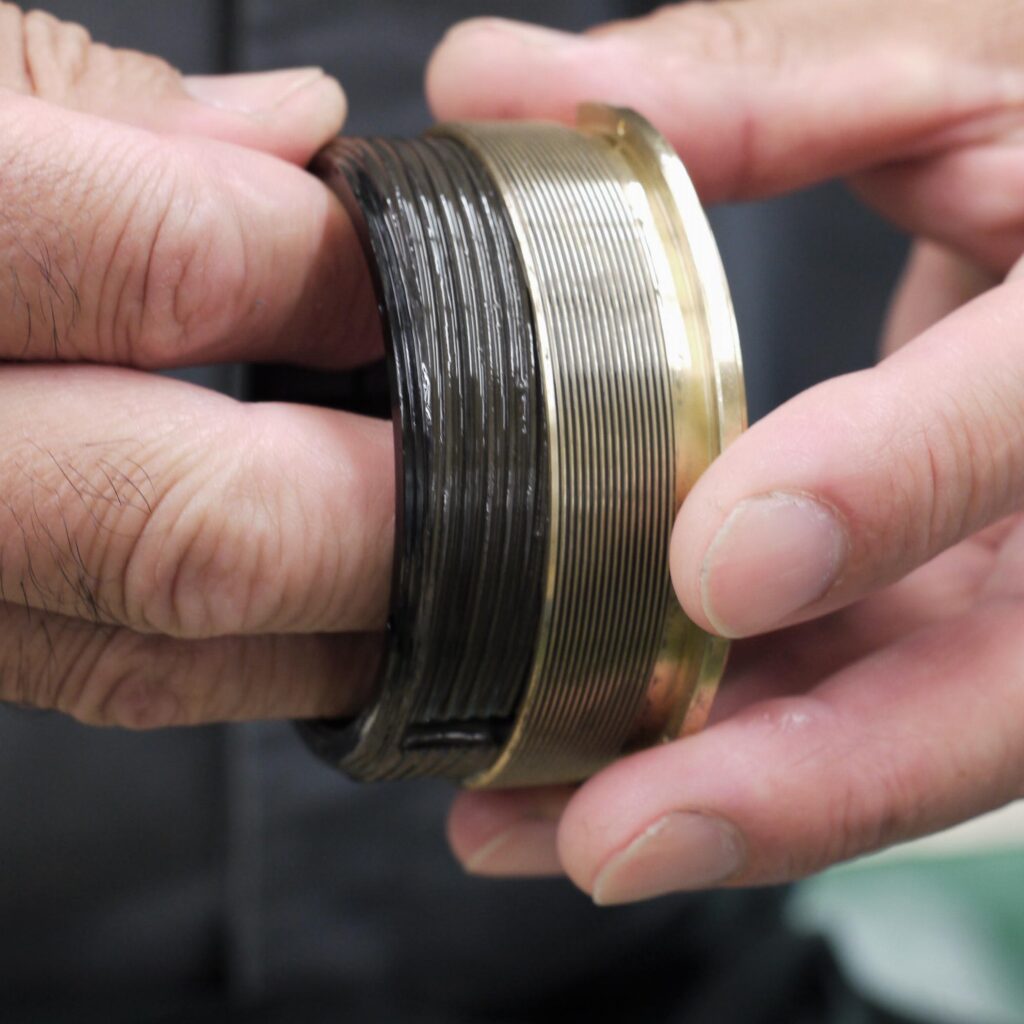 熟練の手さばきで、ふたつの鏡筒部品を何度も回転させる。そして、納得のゆく感触になったら、洗浄して組み立ての工程へと送り出す。これはラッピング(Lapping)と呼ばれる部品同士の微妙な擦り合わせ作業です。ヘリコイドとは、鏡筒の螺旋溝の回転により前後方向にレンズを移動させる機構のこと。通常のネジとは異なりネジ山の断面は台形になっており、多条ネジと呼ばれる副列のネジを採用することで、少ない回転角度で大きな前後移動を可能にしています。ヘリコイドを製作するにはピッチを等分割した複数のネジを切る必要があり、一般的な単列のネジよりも更に厳密な工作精度が要求されます。