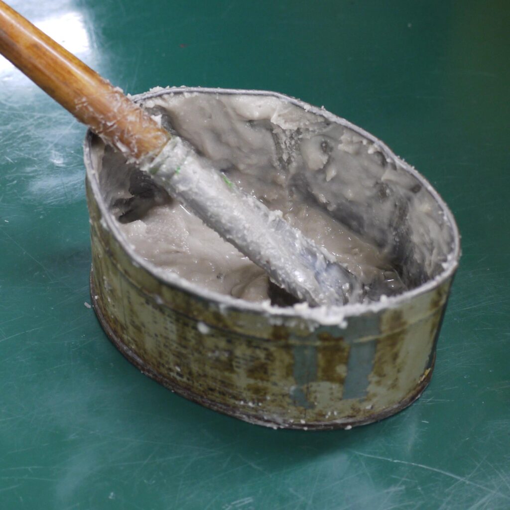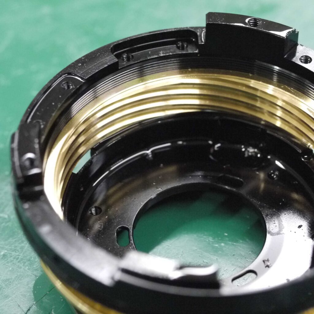 ヘリコイドの溝にラッピング材を塗布し、回転の感触を確かめながら何往復も動かすことで、溝の噛み合わせは非常に滑らかな状態になっていきます。とはいえ、これをやりすぎては噛み合わせのマージンが広がりすぎて逆にガタツキの原因となってしまいます。ヘリコイドの多条ネジにグリスが充填された状態をイメージしながら、最適の感触のところでラッピングを停止する。この『過ぎたるは猶(なお)及ばざるがごとし』という絶妙な判断により、近接から無限遠までスムーズで均一なフォーカシングの感触が実現するのです。