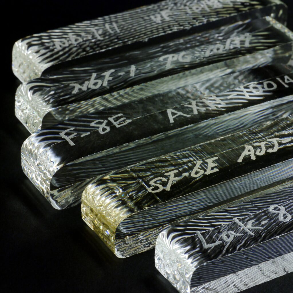 コシナの設計・生産するハイエンド交換レンズには、鏡筒の中に何枚もレンズが入っています。そして、そこには何種類ものガラスが使われているのをご存知でしょうか? レンズやプリズムの材料となる、いわゆる光学ガラスは極めて均質で透明度の高いガラスです。その製造工程において原材料に含まれる成分や配合を調整することで、特性を変化させることができるのです。光学ガラスとして分類される硝材の種類は200以上にのぼります。上の写真は、コシナが原料から熔解して製作した光学ガラスのサンプルピースです。含有元素の違いなどにより、それぞれ異なる特性を持つことを熟知することなしにハイエンド光学製品は成り立ちません。光学ガラスは、いわば高画質の源流と呼ぶべき存在なのです。