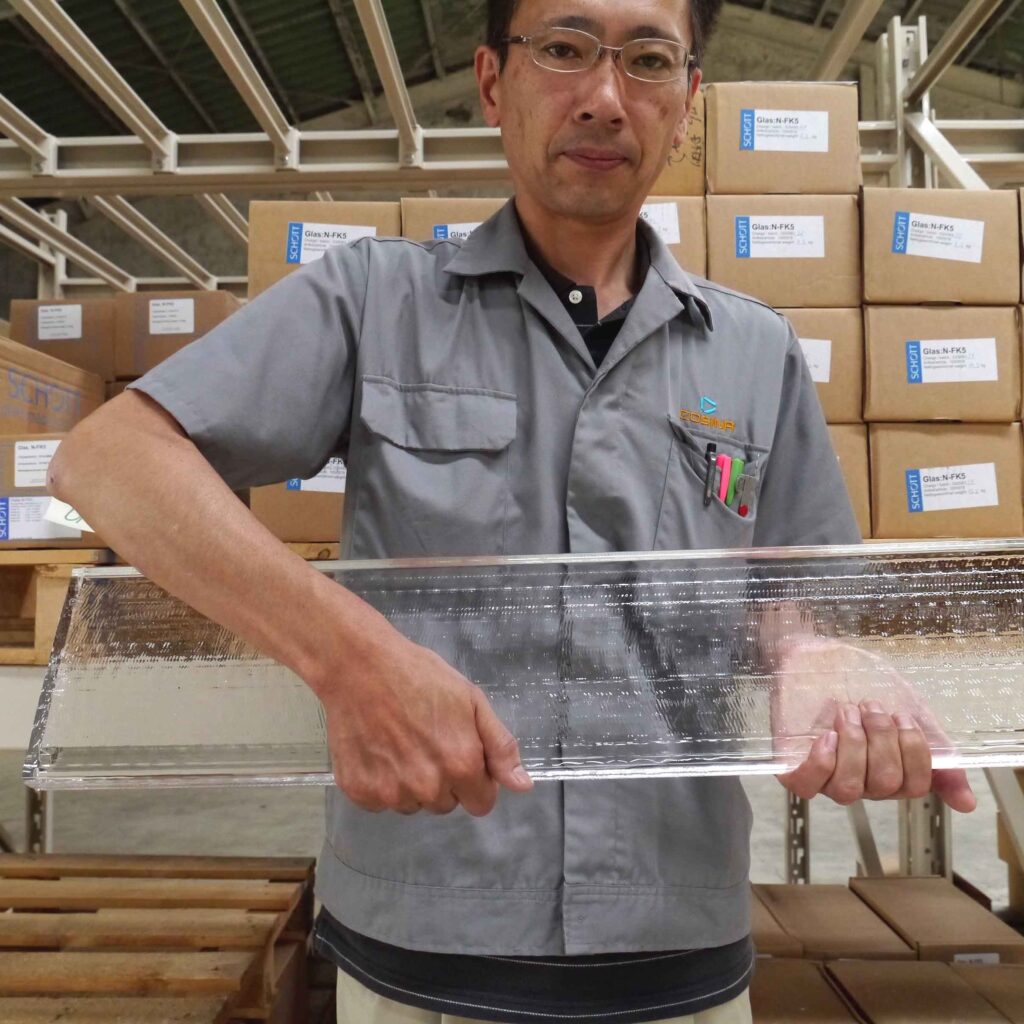 実際のレンズ製造には、延板状になった光学ガラスの“バー材”を使用します。レンズの直径や厚さにより、さまざまなサイズと厚さの“バー材”が用いられることから、ひとつの硝種で何パターンもの“バー材”を用意しておく必要があります。また、これらの“バー材”は素材を熔解したポットナンバーが付記されており、同じ硝種であってもポットごとに微妙に異なる光学特性を持つことから、レンズになるまでの工程すべてにおいてポットナンバーをトレース可能な状態にしておくことが求められるのです。硝種の混合はもとより、同じ硝種であってもポットナンバーの異なるガラスが混ざることは許されません。