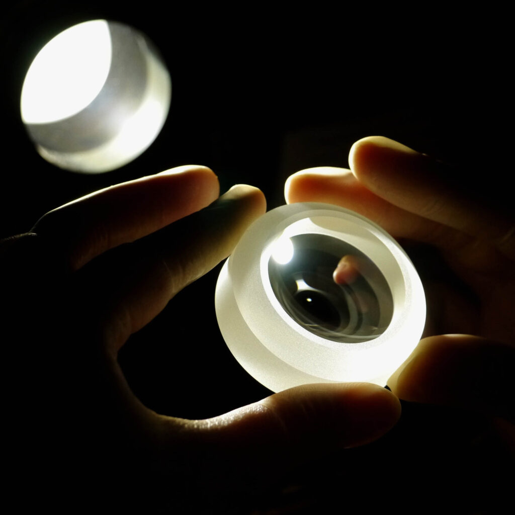 コシナ飯山ファクトリーには、外部からの光が差し込まないように遮光され、粛々(しゅくしゅく)とした雰囲気のエリアがあります。研削や研磨工程の場とは異なり、フラットな配光ではなく極端に照度を落とした空間です。上の写真は、ハイエンド光学レンズの外観について、透過光を用いた目視による検査をしている様子です。レンズを光にかざし、表面および端面にごく僅かな傷などが見つかれば不合格となります。この検査工程に辿り着くまでに、光学的な性能検査に関しては問題ないと判断されたレンズですが、この厳しい外観チェックをパスしなければ製品になることは許されないのです。すべてのレンズは目視で検査されることから、正確さとスピードを求められる工程であり、この技能領域で活躍してくれる大多数は、集中力と審美眼に秀でた社員たちです。