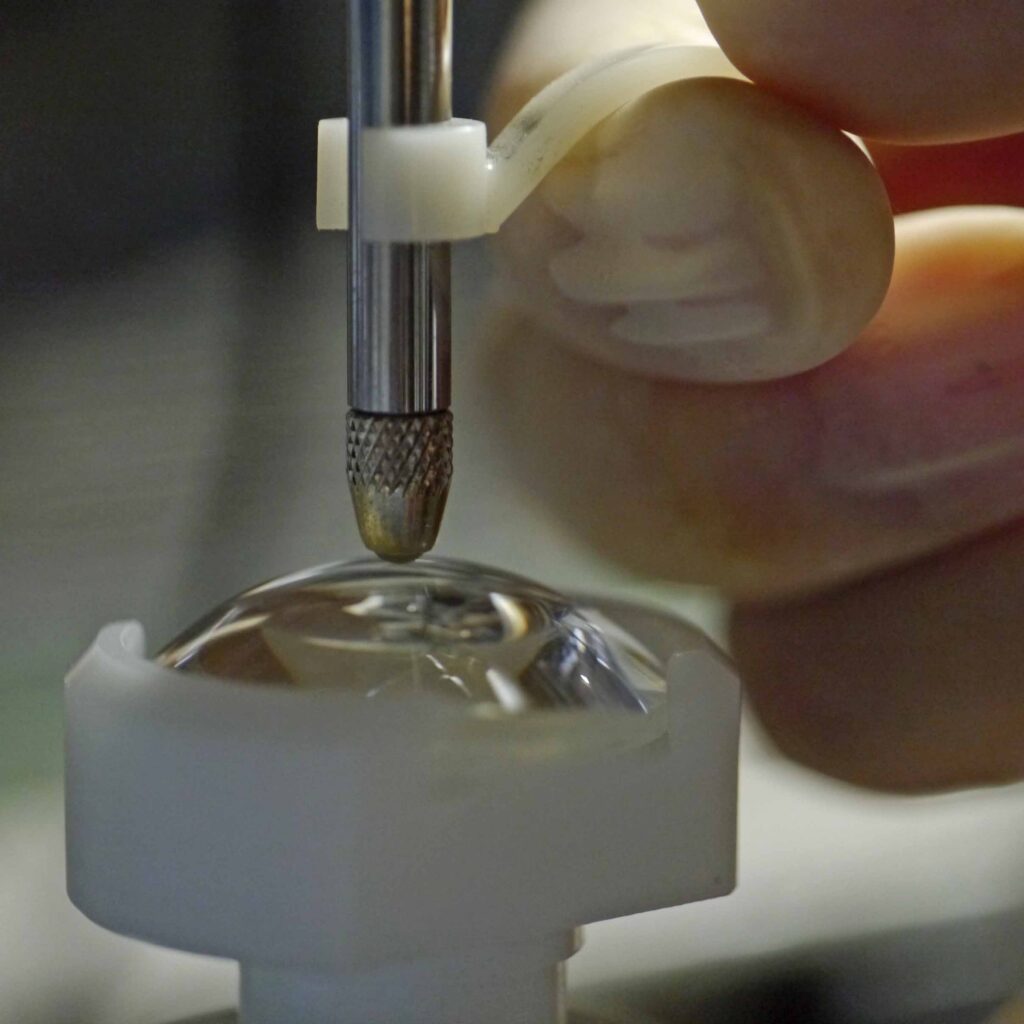 研磨されたレンズの厚さについても、すべてのレンズが厳密に測定されます。公差(工作物の目標寸法に対して、出来上がりに許される最大寸法と最小寸法の差)は1/100ミリに設定され、測定は1/1000ミリ単位で行われます。すべてのレンズで目標寸法との差をゼロにすることは不可能に近いので、公差の範囲においてプラス傾向とマイナス傾向でそれぞれ数グループに分類していきます。複数のレンズを組み込む際に、プラスのグループとマイナスのグループの適切な組み合わせで公差を相殺することでバランスをとり、バラツキのなかで全体の精度を向上させていくのです。