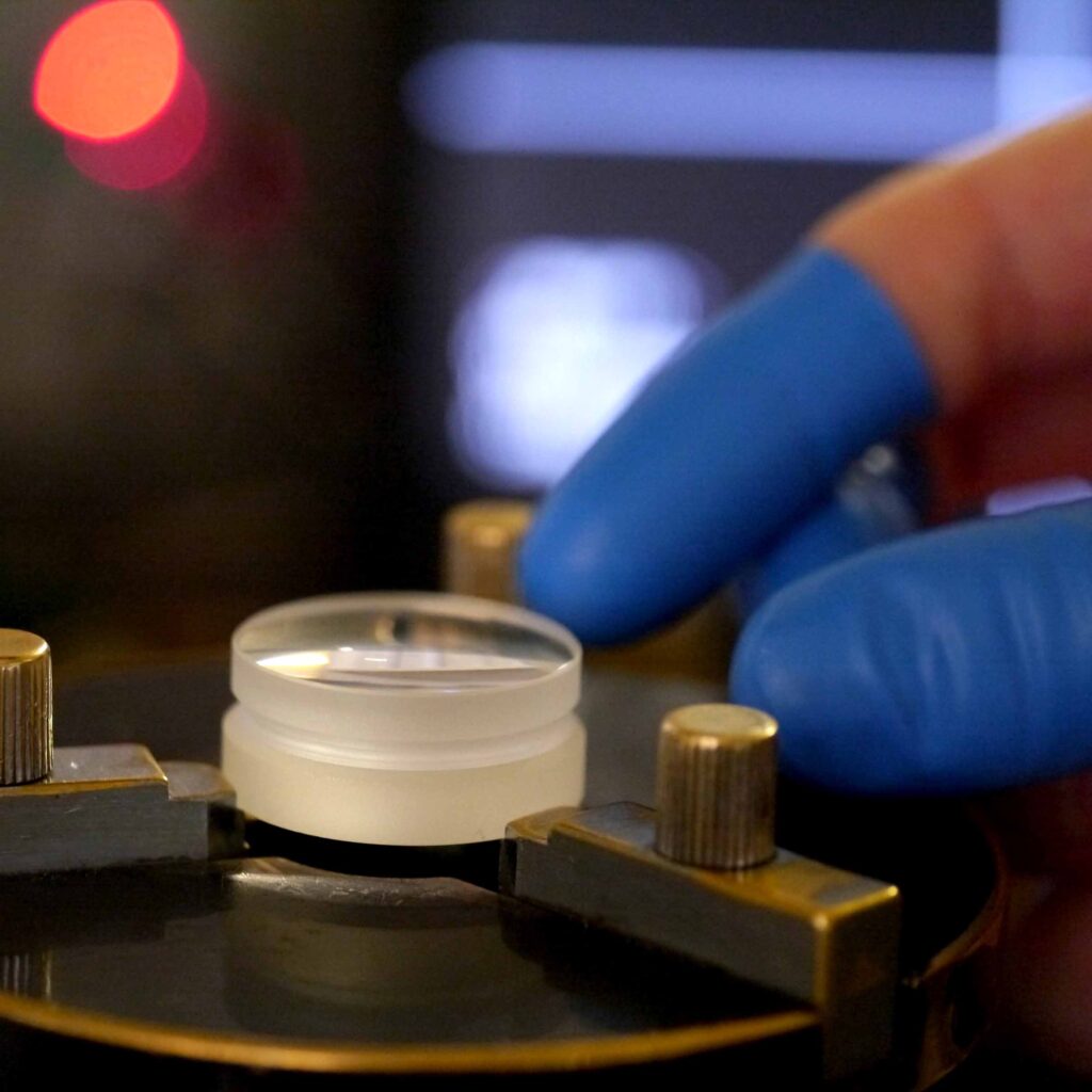 また、心取りされたレンズ(参照:022レンズの中心を見極める心取り)の光学的な中心がズレていないかどうかを厳密に測るレーザー試験機を活用した測定検査も、すべてのレンズで行われています。特に複数のレンズを貼り合わせて製作したエレメントでは、1枚のレンズよりも偏心してしまう確率が上昇しますが、同じ条件で検品します。そして規定の水準に達していなければ、製品を構成する光学部品として採用されることはありません。すべてのレンズにおいて外観、厚さおよび光学的中心の合致の3項目が厳密に検査され、合格したものだけが次工程に進むことができるのです。