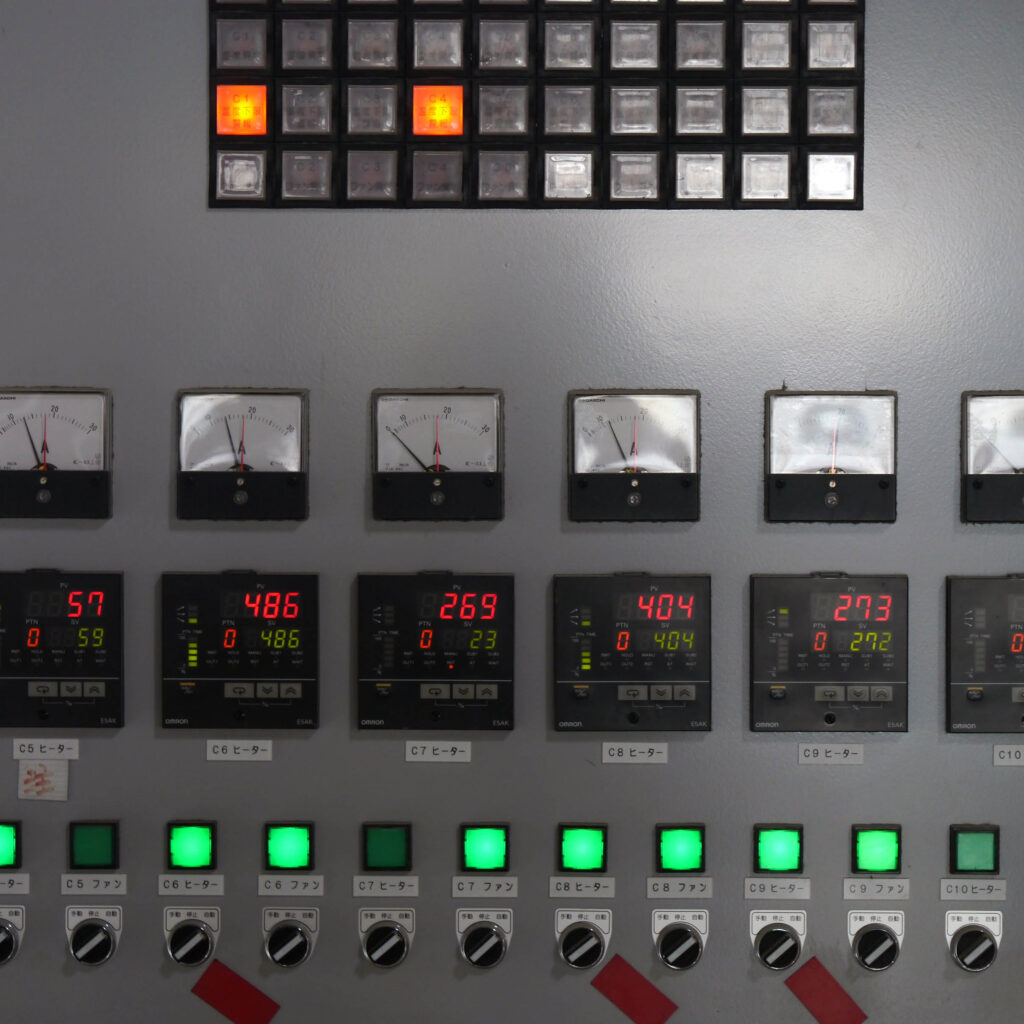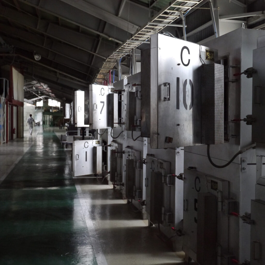 上の写真は、コシナ小布施ファクトリーに数多く設置された電気炉の様子です。これらはアニール炉と呼ばれる装置群です。アニールとは、焼き鈍し(英:anneal)のこと。高温のプレス加工によって形づくられたレンズ原形は、そのまま研削/研磨の工程に進むことはありません。その前にアニール炉の中でふたたび加熱され、それからゆっくりと温度を下げられていくのです。光学ガラスはプレスの急速な冷却などにより、その内部で分子の配列が乱れているとレンズとして充分な機能を果たせません。そこで、厳密な熱処理によって分子の配列を整えるアニール処理を経ることで、光学ガラスの性能を均質化していくのです。