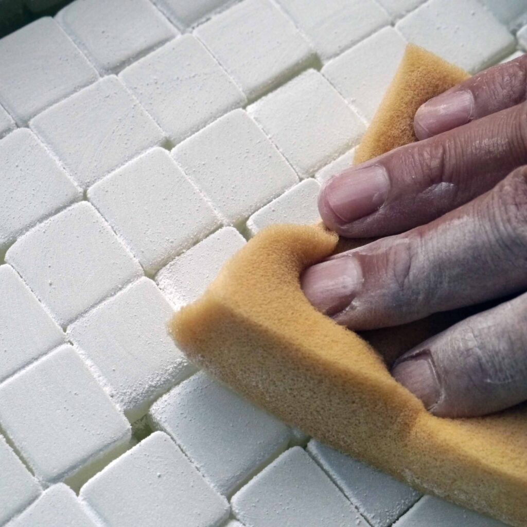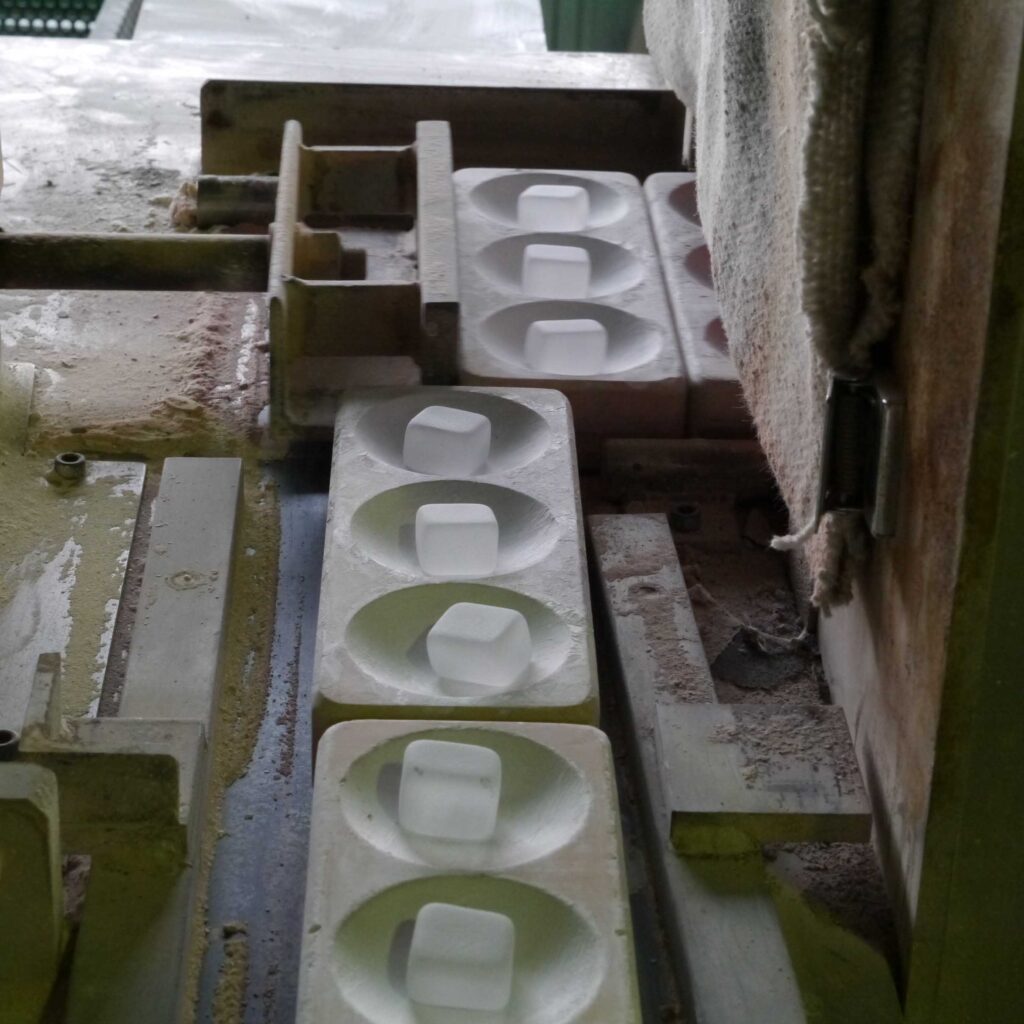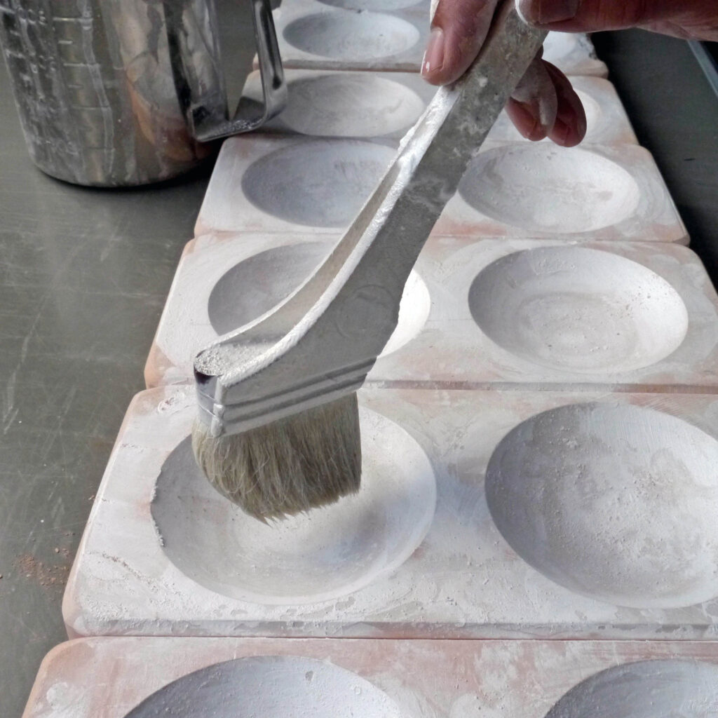 光学ガラス切断品を電気炉の中で熱するのに使われる加熱皿は、そのままの状態で電気炉に入れられることはありません。あらかじめ離型剤と呼ばれる微細な粉末状の物質を表面に塗布するのです。このことにより、電気炉の出口で加熱皿からプレス金型に光学ガラス切断品を移し替える作業は、熱せられ丸く形を変えた光学ガラス切断品が加熱皿にくっついてしまったりすることなくスムーズに進めることができるのです。上の写真は、加熱皿に離型剤を塗布している様子です。窪みひとつひとつを丁寧に、手作業で仕上げていきます。