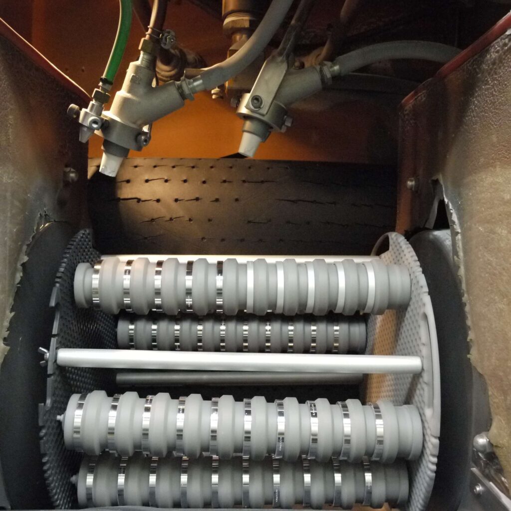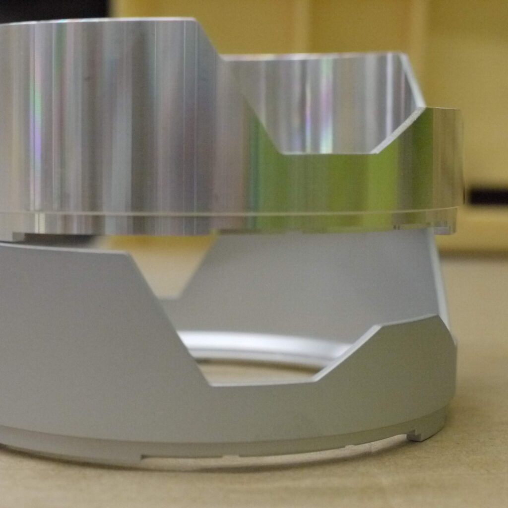 削りたての金属の表面は平滑で、まるで鏡のように光っています。そのままでは傷がつきやすく、手にすれば冷たく張り付くような感触です。そこで金属の表面を、すこし曇らせる加工をすることで、サテンのような手触りに変化させます。この工程が、サンドブラスト処理です。コシナの製造するハイエンド光学製品では、人の手に触れる金属外装のほとんどが削ったままではなく、素地にサンドブラスト処理を施しています。 サンドブラストでは、細かい粒子状の研磨材をブラスターガンで圧縮空気と混合して吹き付けることにより表面を加工します。シンプルなリング状の部品の場合、上の写真のような自動加工機にセットして一定量を同時に仕上げます。