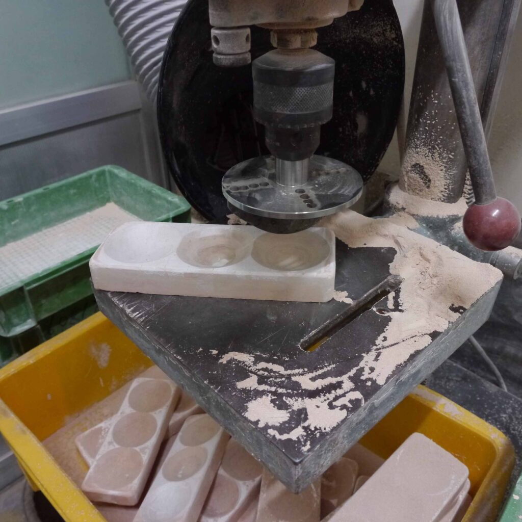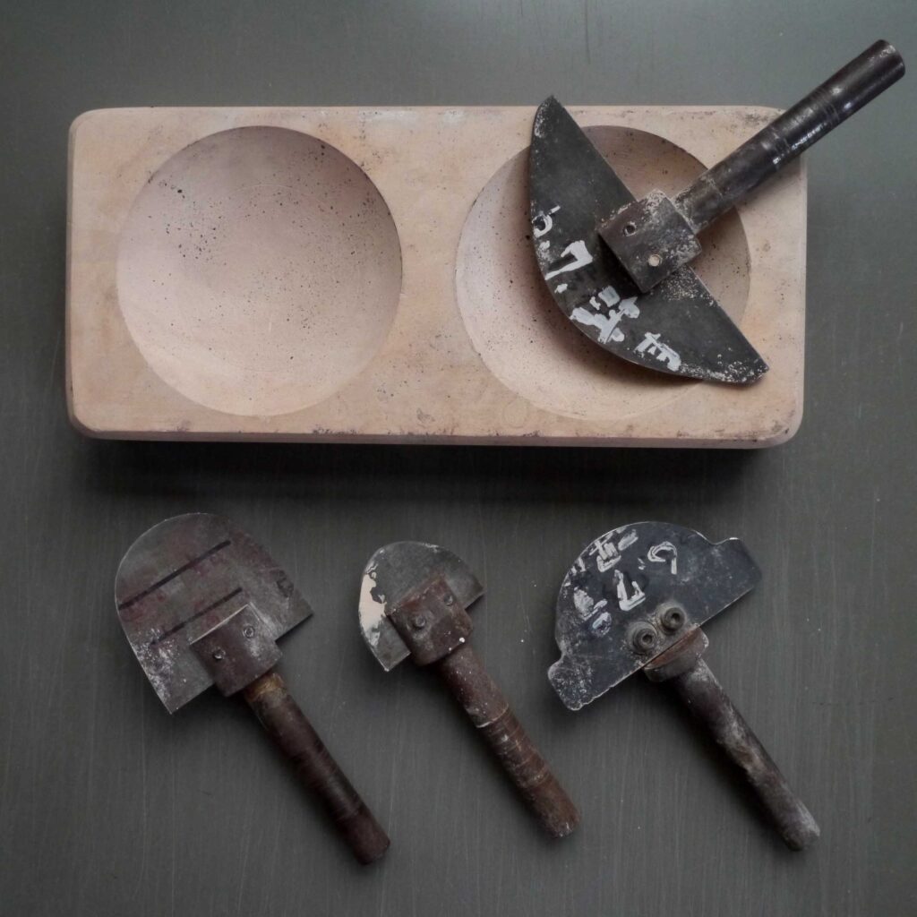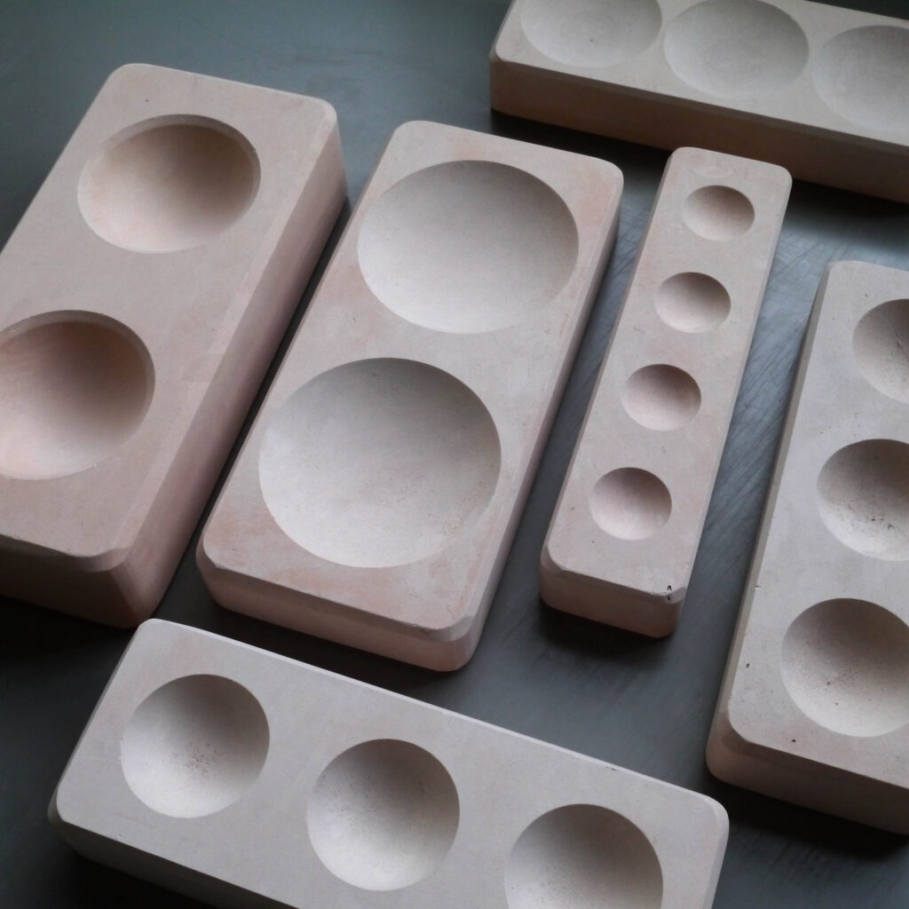 珪藻土は軽いだけでなく熱の伝わりが低いことから、電気炉へ入れても熱の吸収が少ないので炉内の安定した温度管理を阻害しません。摂氏700度前後で熱せられた光学ガラス素材は電気炉の中で次第に軟らかくなり、加熱皿の窪みに沿って変形していきます。電気炉の出口で待ち構えているプレス金型のサイズよりも微妙に小さい丸い形になるよう、加熱皿は設計されているのです。このとき四角い光学ガラス切断品の四隅が加熱皿と擦れ合うので、繰り返しの使用によって加熱皿の窪みの形に不均一が生じてきます。そこで定期的に規定の曲率を保つよう修正しています。