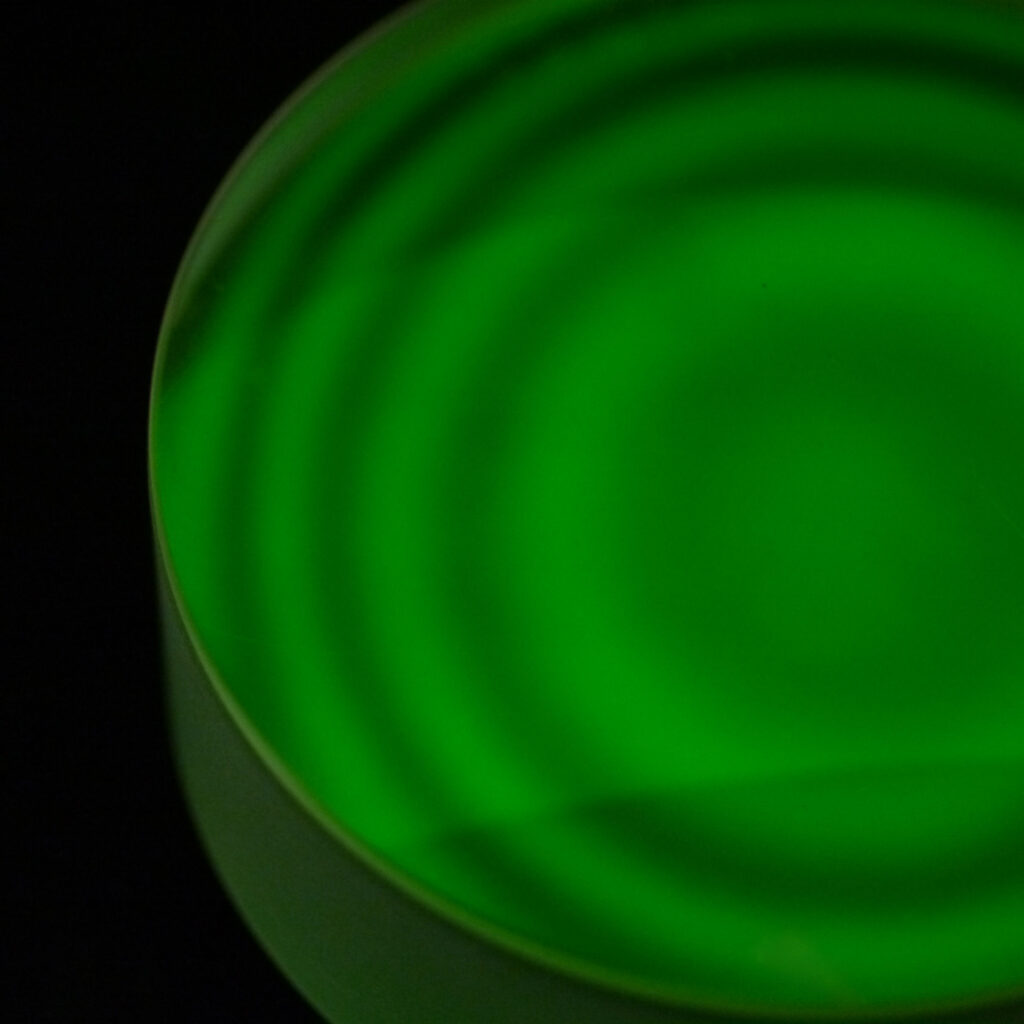 上の写真は、ニュートンリングと呼ばれる現象を撮影したものです。ニュートンリングとは、ぴったり重ね合わせた2枚のレンズに光を当てることで観察できる同心円状のリングのこと。レンズの接触面に僅かな空気の層があると、そこで反射した光が干渉することによって発生します。万有引力の法則をはじめとする古典力学の創始者ニュートンが発見したことから、この名が付けられています。接触させた2つのレンズの面がまったく同じ曲面であれば、その間に空気は入らずニュートンリングは発生しません。曲面のズレが大きく空気層の厚さに差があるほど縞の数は増加します。この現象を利用して、発生したニュートンリングの本数からレンズの曲面精度を知ることができるのです。
