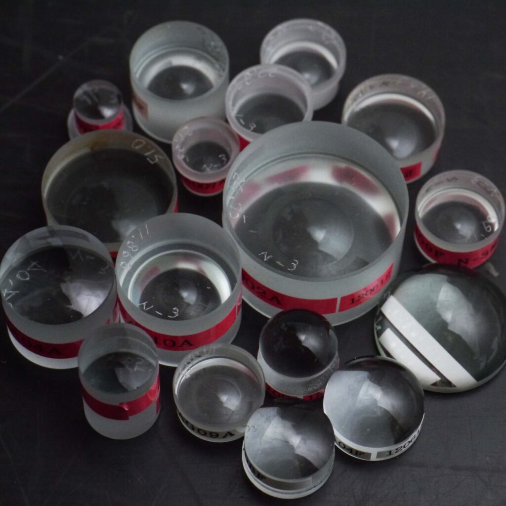 そこで必要となってくるのが、レンズの面形状の基準となる『レンズ原器』です。原器は透明のガラス材で作られ、その曲面がレンズ面の原型を示しています。非常に高い精度を持った『レンズ原器』は、優れた光学製品を生み出すのに重要な役割を果たします。一般的なレンズ面は球面の一部であることから、その種類は球の半径=Rで示されます。たとえばR40なら、半径が40ミリメートルの球面を示し、数値が大きいほど緩やかで、小さいほどカーブの強い曲面となります。設計仕様にあわせ、さまざまな曲面の『レンズ原器』が準備されており、研磨されたレンズと照らし合わすことで厳密にチェックされていくのです。