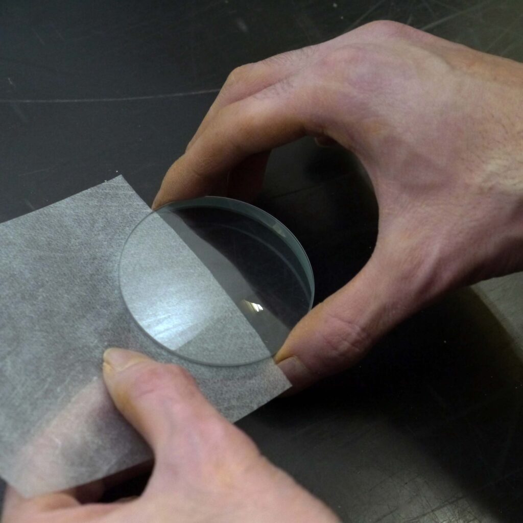 レンズと逆の曲面を持つ研磨皿と光学ガラスを擦り合わせることで作り上げられたレンズ面の形状は、はたして設計仕様に合致しているか? レンズ研磨の工程では『レンズ原器』とレンズ面との間に発生したニュートンリングを目視し、その状態によってレンズ面の精度を把握しながら作業は進行します。研磨完了後の精度確認にも『レンズ原器』によるニュートンリングの本数チェックが行われています。ここで基準となる原器にレンズをのせるとき、その間にシルボン紙をあて、そっと引き抜くようにして原器とレンズを重ね合わせます。これは微細な埃などが原器とレンズの間に入るのを防ぐことはもちろんですが、いわば“レンズのご神体”とも言える原器に対する気づかいも含まれた、こだわりの作法なのです。