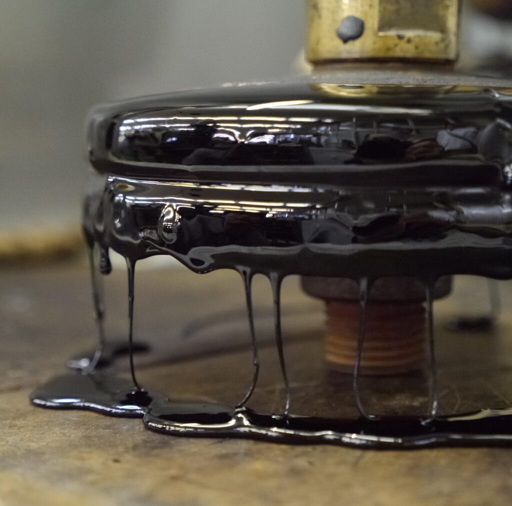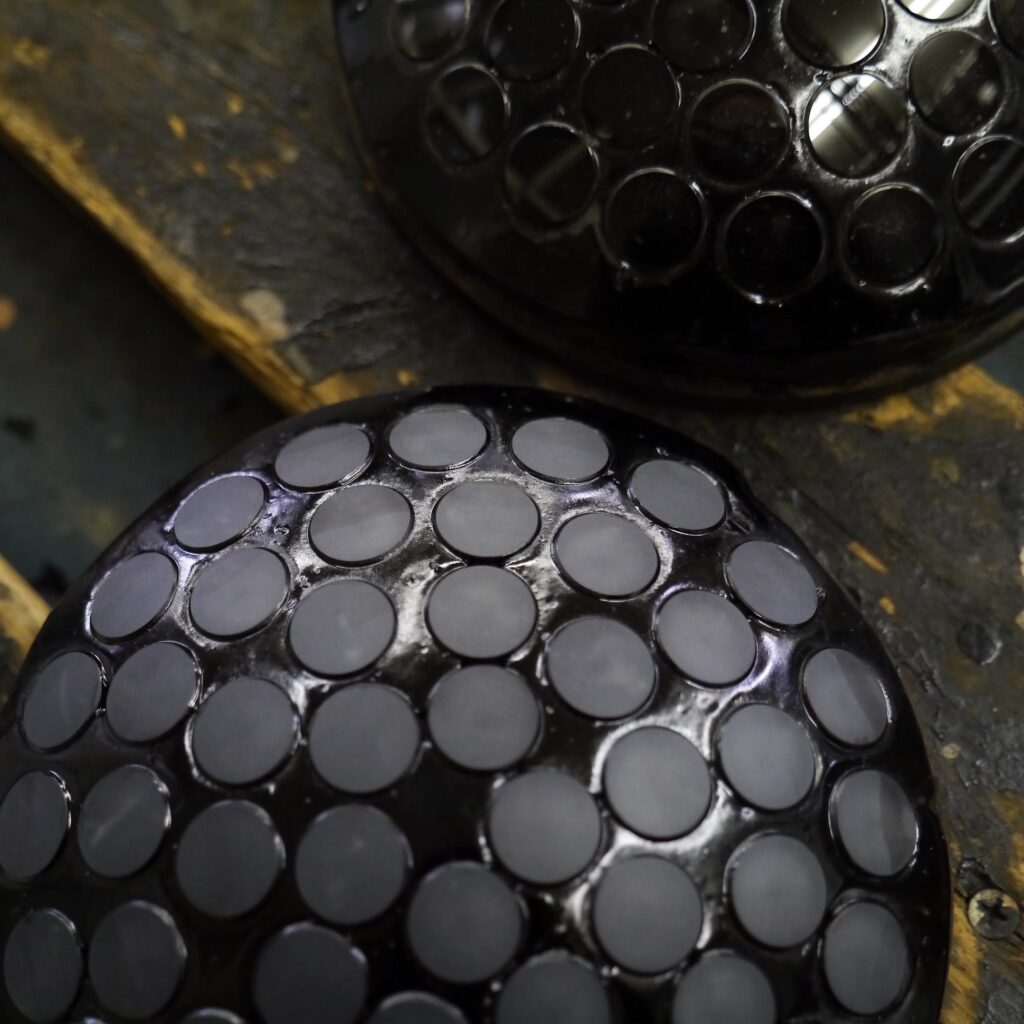 そこで使われるのが、熱可塑性をもつ特殊なピッチ材です。粘度のある液状になるまで熱せられたピッチ材を多数個のレンズが水貼りされた定磐の上に流し、受け皿と組み合わせます。こうすることで軟らかいピッチ材にレンズは沈み込み、常温に冷やされ固形化したピッチ材によって固定されます。あとはハンマーの一撃で2枚の皿を分離させれば、定磐の曲率を移し替えた状態で多数個のレンズが姿を現してくれるのです。これらの工程は、すべて熟練の手作業によるものです。慎重に、そして大胆に作業は進みます。