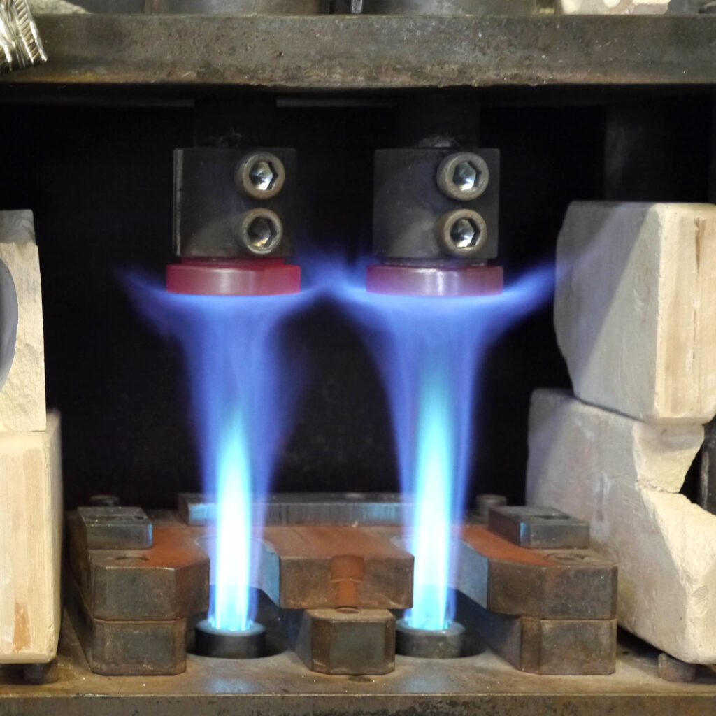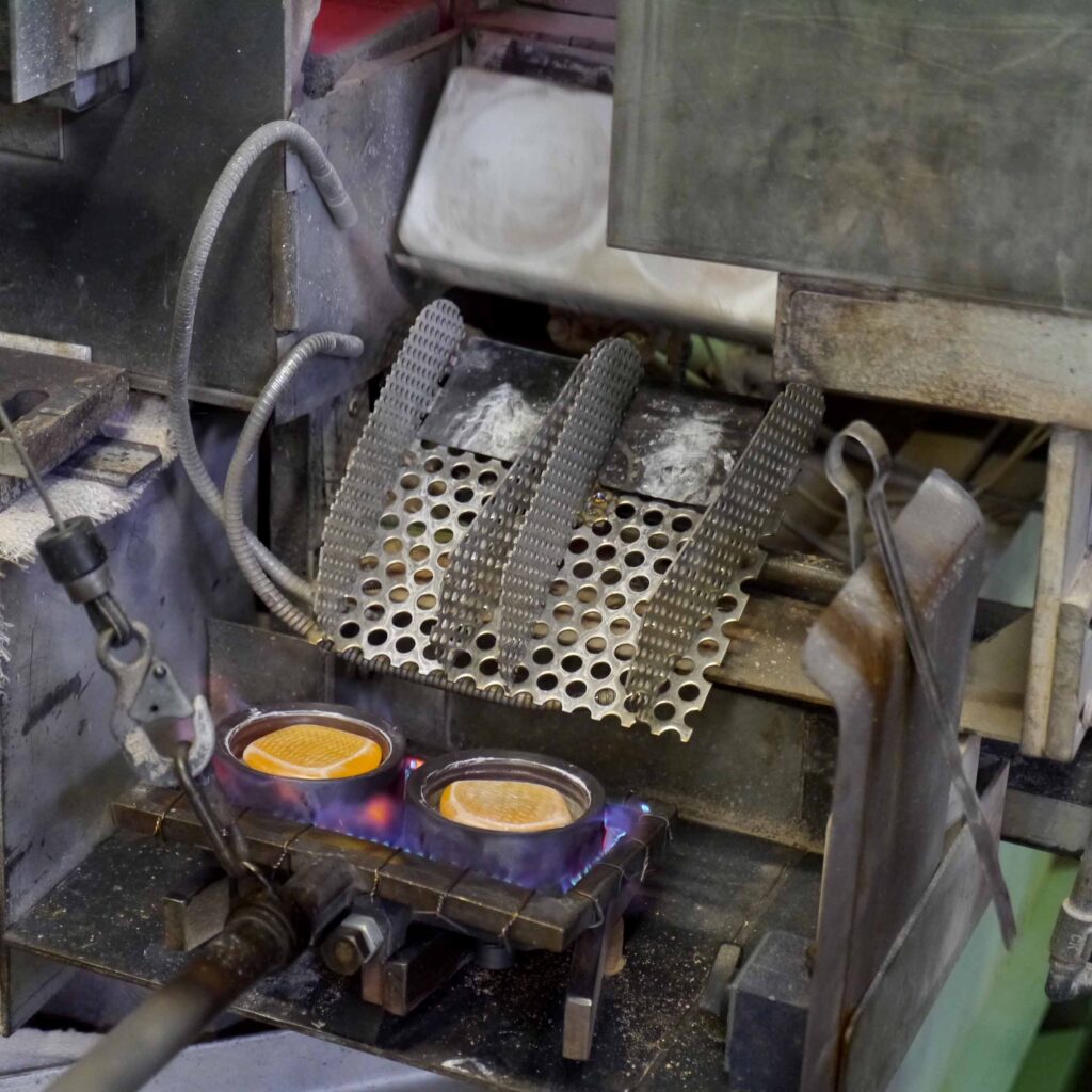 小布施ファクトリーでもっとも熱いセクション。それがレンズ原形をプレス成形する現場です。上の写真は、大型の電気炉で加工できる粘度まで熱せられた光学ガラス素材をプレスして、レンズの形にする機器です。プレスしている最中に光学ガラスの温度が下降することを抑止すべく、バーナーの炎がプレス型を熱し続けています。プレス型の表面温度は高精度のスポット温度計でモニタリングされ、規定の温度が厳密に保たれています。温度はプレスする光学ガラスの種類により異なりますが、摂氏500度から700度。大型の扇風機や業務用スポット冷風機が稼働していますが、それでも猛烈な暑さを感じます。この熱気は、炎を扱うものづくりの現場に特有のものです。
