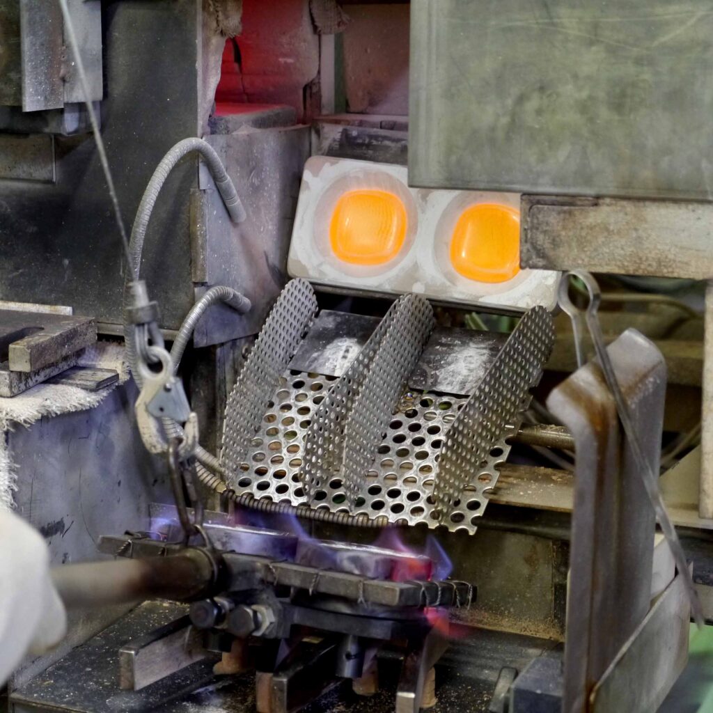 電気炉から出てきた光学ガラスをプレス型で受けてプレス機にかける工程は熟練の手作業です。プレスの保持時間が長すぎるとプレスした後に常温に戻っていく段階で割れてしまう場合がありますし、プレス時間が短すぎれば仕上がりの形が不安定になります。この微妙な頃合いを熟知しなければ良品を作り出すことはできません。光学ガラス素材にはさまざまな種類があります。それぞれに適した加熱のメソッドと加工温度があり、それは同種の光学ガラスであっても仕上げ寸法によって異なります。猛烈な暑さのなかで、非常に繊細な温度のコントロールが行われています。