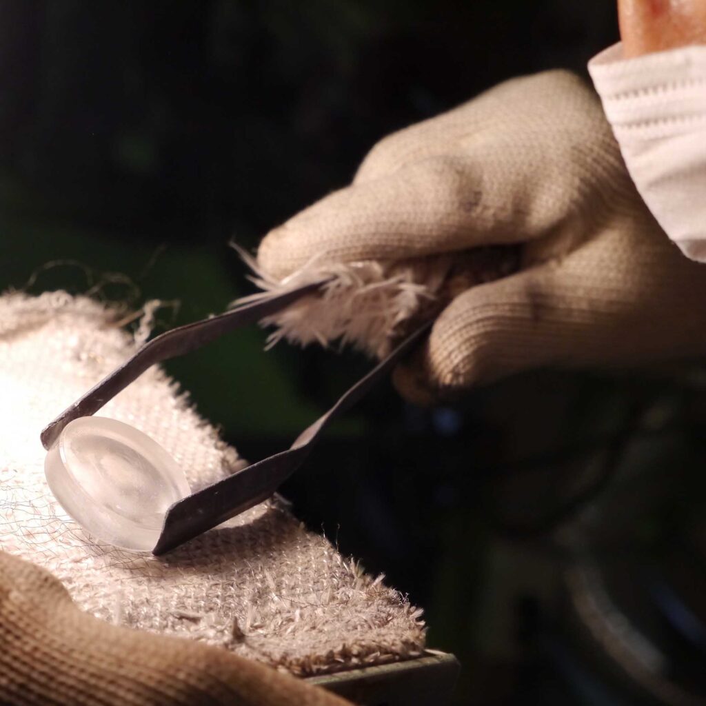 高温に熱せられてプレスされ、四角かった光学ガラス素材は、いよいよレンズの原形となります。美しいテクスチャーと形をもつレンズ原形ですが、良品を作るには並々ならぬ努力を注ぐ必要があります。温度管理やプレス加工に少しでも不備があると、光学ガラスの命ともいえる透明度を失ってしまう失透(しっとう)やクラック、角の折れ曲がりなどが生じてしまうのです。さまざまな種類の光学ガラス素材から、最高のレンズ原形を生み出す。大量生産品とは一線を画す熱い思いが、ひとつひとつのレンズ原形に込められています。