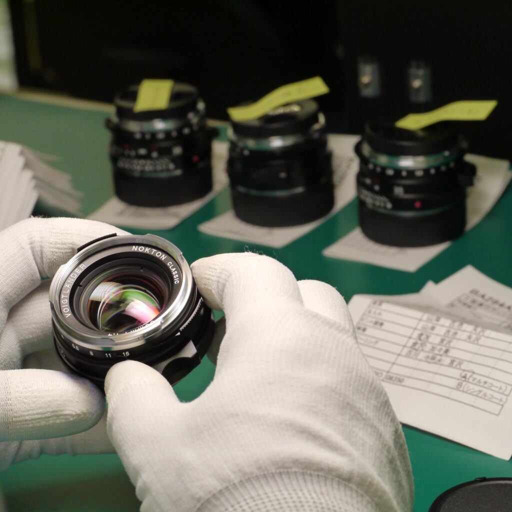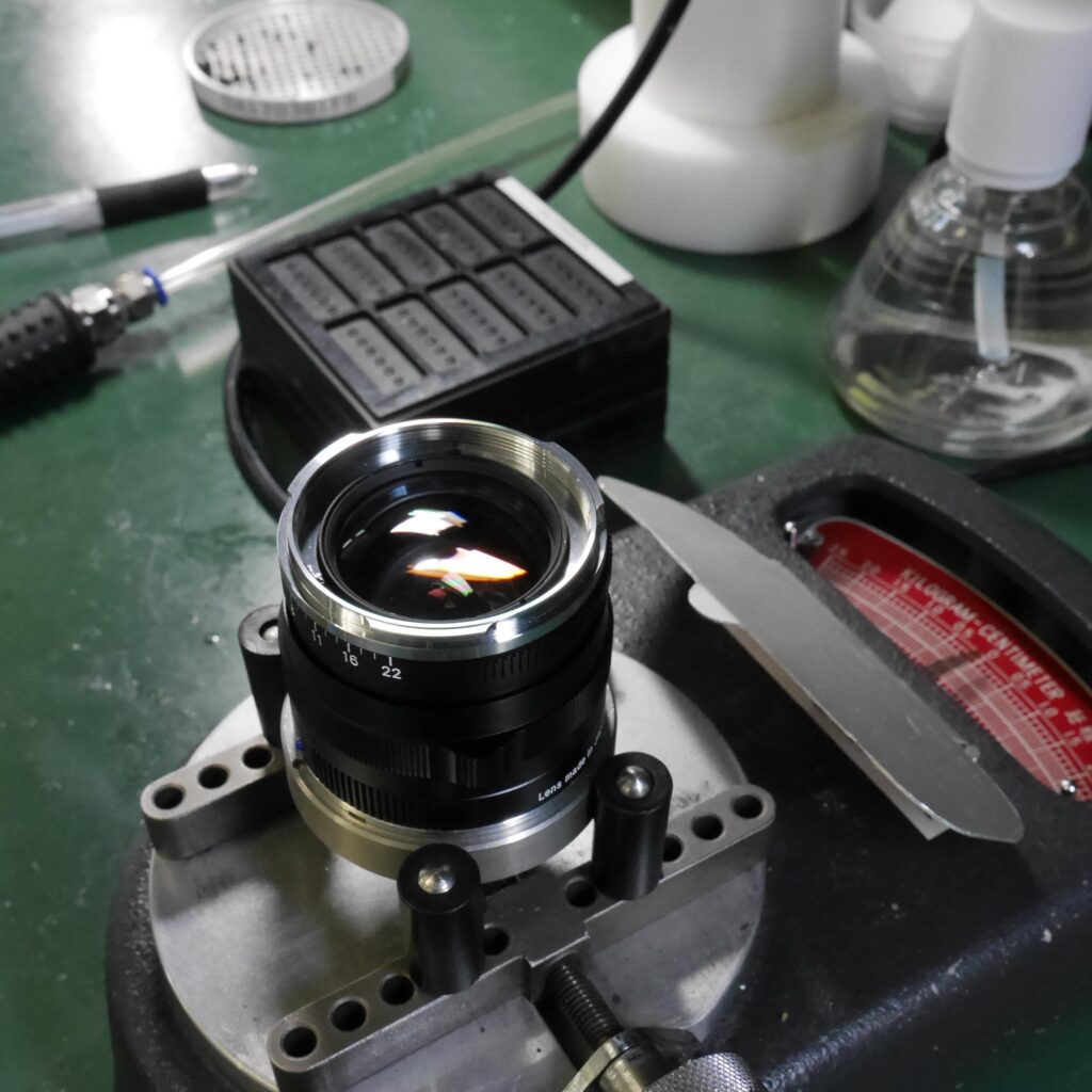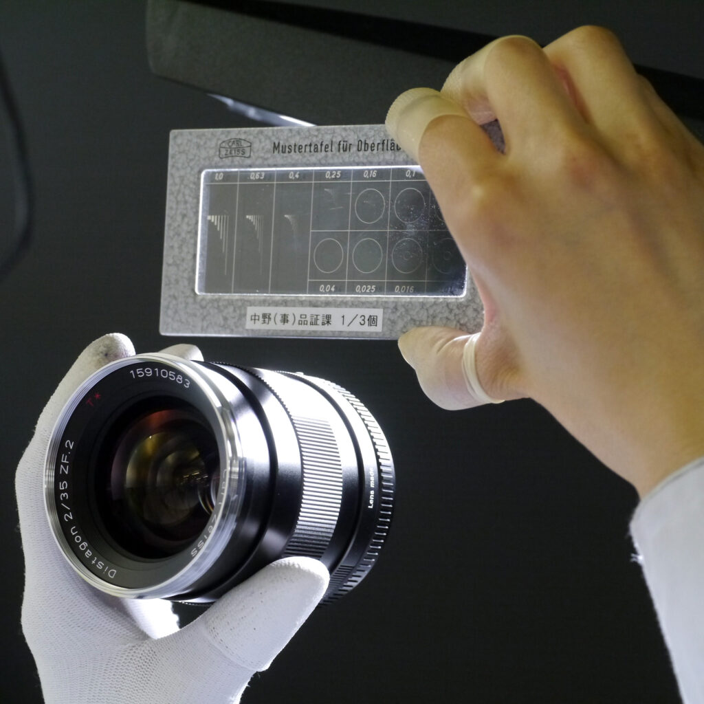組立てが完了し、製品として仕上がったハイエンド交換レンズは1本1本が最終チェックの段階に入ります。上の写真は、目視によりレンズ内部に微細なレベルでの異物混入の有無を確認している様子です。レンズの上にあるのは、ホコリやキズと照らし合わせてスケールを見る特殊な道具です。規定のサイズより大きな異物混入などがあれば、良品として最終チェックをパスすることはできません。この基準値を大幅に緩和したとしても写真撮影の結果に影響は及ばないのですが、それでも私たちは美観も性能のひとつと捉え、あえてハードルを高く設定しているのです。それは極上の道具だけが持つ、際立った美しさや操作の感触を知り尽くしたお客様が求めている品質だからです。