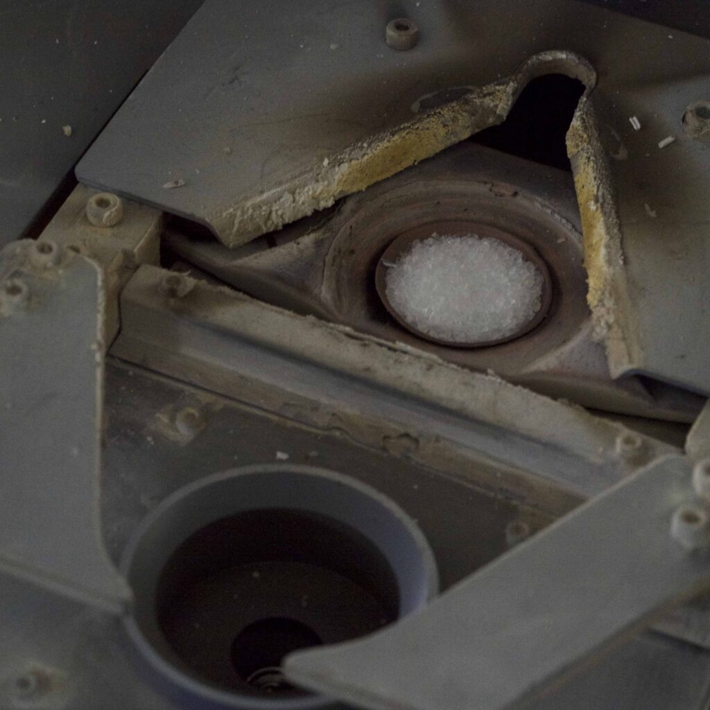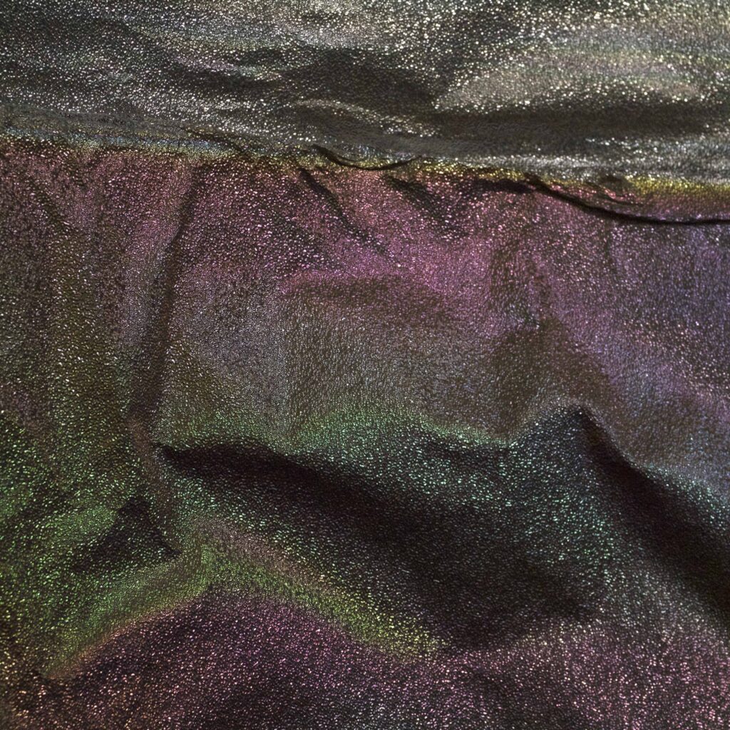 虹色に反射する、抽象絵画のようなパターン。あるいは鉱物の顕微鏡画像を連想させるイメージ。上の写真は、レンズの反射防止コーティングに使用する真空蒸着装置の内壁に貼ったアルミ箔をクローズアップ撮影したものです。ある容器の中に存在する空気を除去して作り出された真空状態では、気体分子は衝突することなく飛び回れる距離が長くなります。この性質を利用して、コーティングが施されます。真空中で気化されたコーティング材は容器の内部を自由に動き回り、薄膜を形成するのです。この虹色のパターンは、ハイエンド光学レンズの表面と同様に、内壁もマルチコートされたことで出現しているのです。