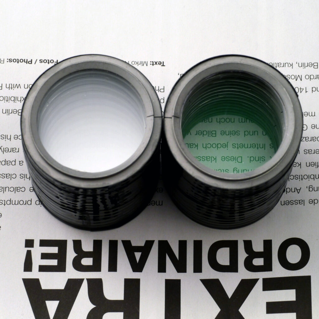 上の写真は、複数のフィルターを積み重ねて印刷物に置き、文字の可読性を確認している様子です。左は素通しの光学ガラス、右は反射防止コーティングが施されています。一般的な光学ガラスは表面で約4%の反射が発生し、両面で8%の光量ロスが生じます。たとえば5群6枚で構成されているレンズでは、ガラスと空気の境界は10面となり、各面での透過率が96%であれば10面を通過した光は66.5%に減衰。実に1/3以上の光がガラスの表面で反射してしまうのです。本来ならばフィルムや撮像素子に結像されるべき光は、レンズ鏡筒の中で反射を繰り返し、結像性能に悪影響を与えるフレアあるいはゴーストという現象を引き起こしてしまいます。これを抑止する目的を果たすのが反射防止コーティングです。
