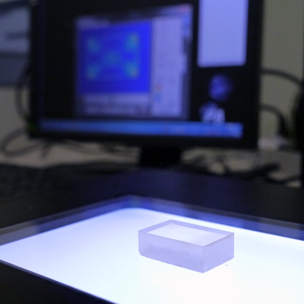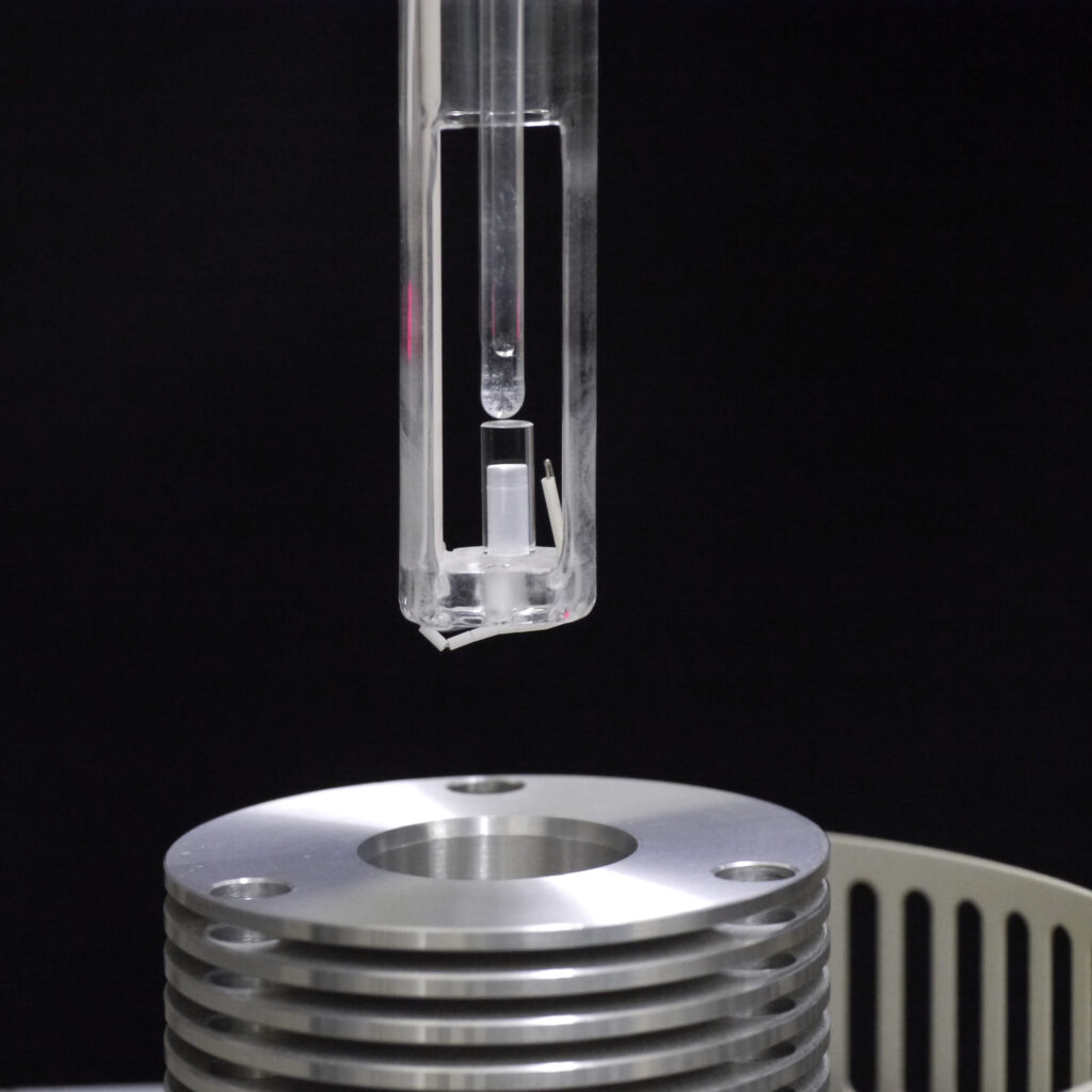 新たに開発された光学ガラスは光弾性だけでなく、さまざまな切り口で計測して実験結果の検証を進めていきます。ハイエンド光学デバイスへの応用という観点から、実験室レベルではなく生産の現場において量産が現実的かどうかも重要なポイントとなります。このことから、生成の過程で熔解状態にあるガラス原料から不透明な物質が出現してしまう“失透”の起きやすさとその温度領域を調べることや、プレス成形における温度設定の重要な鍵となるガラス転移点(TG)なども測定されます。