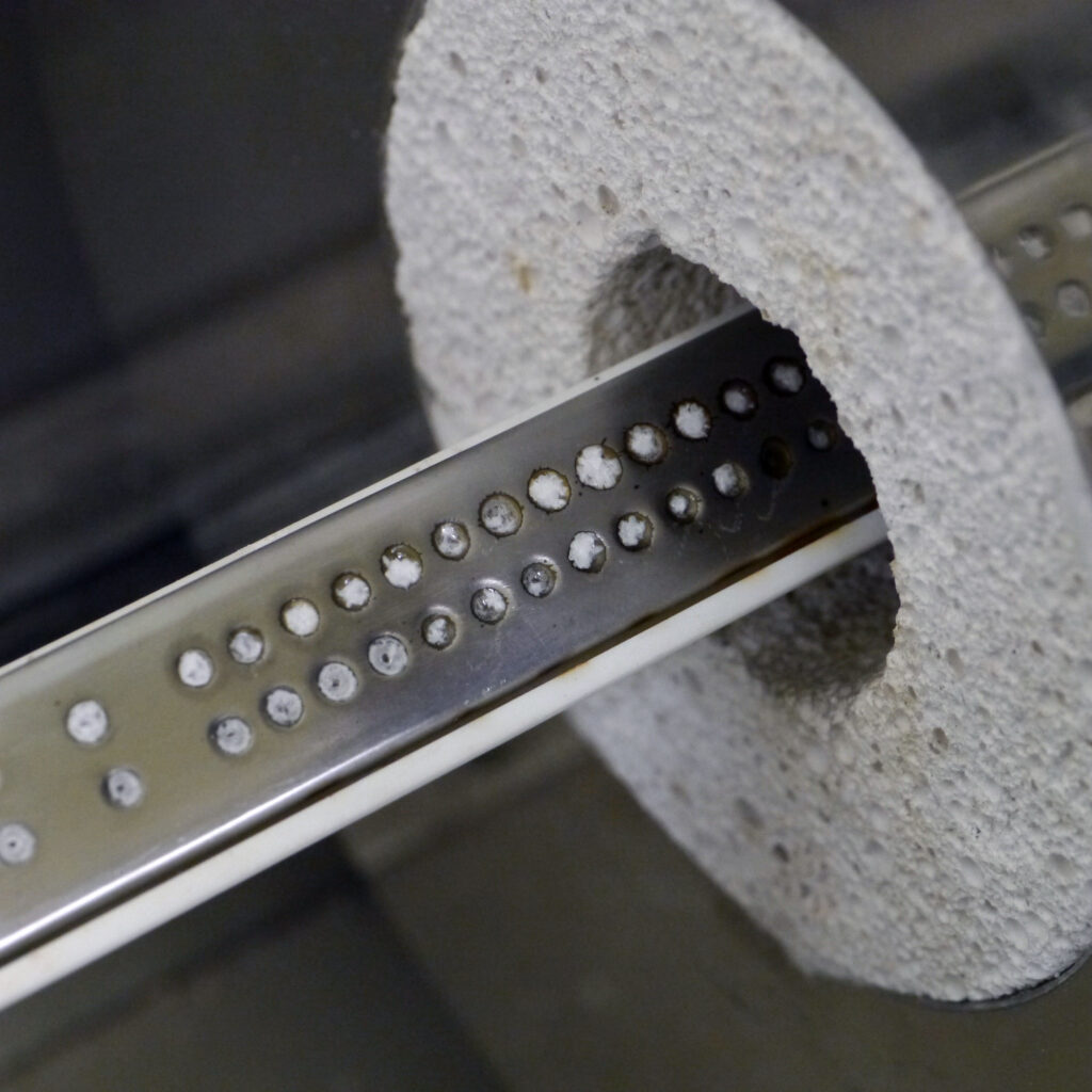 実験により生み出された新種の光学ガラスは、どのような特性を持つのか精密に測定されます。上の写真は、ガラスに外力が加わった場合に光が複数の屈折を起こしてしまう度合いを示す光弾性を計測している様子です。光学デバイスはレンズ単体で機能することはなく、必ず金属枠などにセットされています。そこから熱などの外力が加わることで、一時的に大きな複屈折を生じるガラスがあります。このような光弾性の大きな光学ガラスでは用途が限られてしまいます。鉛を使用する光学ガラスは光弾性が小さいという特性を持っていましたが、代替材料である酸化チタンなどを用いると、この数値が大きくなる。そこで、環境保全と性能を両立させるべく光弾性の小さい光学ガラスの開発に取り組んでいるのです。