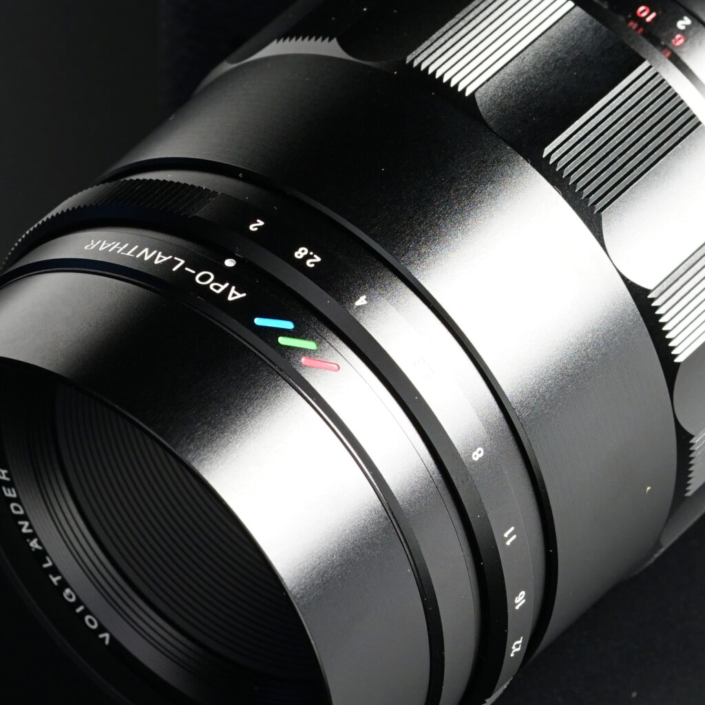 MACRO APO-LANTHAR 65mm F2 Asphericalの鏡筒先端部には、BESSAIIを始めとするAPO-LANTHARに施されていた装飾へのオマージュとして、RGBの差し色を配しています。