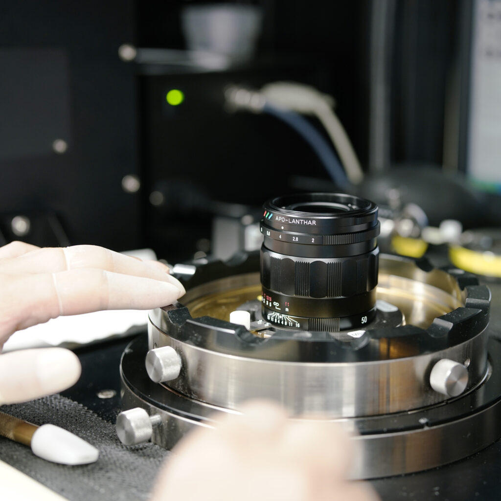 「製造の見学をしていただいたアポランター50mm F2は、レンズを単純に組み込むのではなく、光軸やレンズ間隔を測定・調整しながら組んでいます。MTF測定装置を導入する以前は投影解像チャートを用いるなど間接的な方法で測定し、光軸を出しながら組み立てていました。MTFの数値を計測しながら1本1本のレンズが最高の性能を発揮できるように調整するようになったのは、コシナがフォクトレンダーのレンズを設計・製造するようになって5年ほど経過した2004年頃からです」